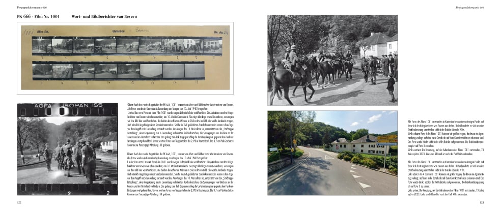 Der erste Teil des Buches gibt eine Einführung in die PK und nimmt sich vieler Fragen zum Thema Propaganda an, welche bisher noch nie gestellt wurden. Der zweite Teil des Buches, der ca. 80% des Bandes umfaßt, schildert am Beispiel der Propaganda-Kompanie 666 den Einsatz einer solchen Einheit im Westfeldzug. Die Berichter der Kompanie waren dabei der 12. Armee zugeteilt und daher mit den Infanterie-Divisionen des III. Armeekorps und des Panzerkorps-Guderian im Einsatz. Das Buch schildert chronologisch die Kämpfe der Divisionen. In diese Geschehnisse werden die Fotos, Berichte der Kriegsberichter der PK 666 eingeflochten. Man folgt also dem Vorstoß Guderians durch die Ardennen, nimmt an den Kämpfen um Sedan und am Maas-Übergang teil, stößt mit den Panzer-Divisionen Guderians über Stonne, St. Quentin, Peronne, Abbeville und Montreuil auf Boulogne und Calais am Ärmelkanal vor und erlebt schließlich die Kämpfe um die hart verteidigten Festungen in den beiden Hafenstädten.
