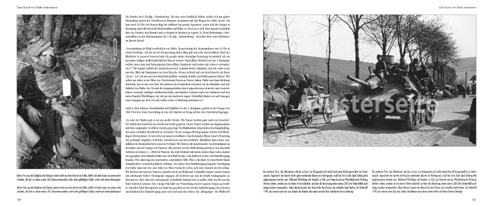 Die Geschichte der Panther-Abteilung Brandenburg und die Vorgeschichte als I. Abteilung des Panzer-Regiments 26 spielen sich vor dem Hintergrund der überall zusammenbrechenden Fronten der letzten eineinhalb Kriegsjahre ab. Der Leser nimmt an den Rückzugskämpfen in den weiten Steppenlandschaften Südrußlands und Rumäniens und den Gefechten an der ostpreußischen Grenze und im Baltikum teil. Er wird Ende 1944 mit der Abteilung im Brückenkopf Memel in Ostpreußen eingeschlossen und erlebt die Entsatzvorstößen auf Budapest Ende 1944/Anfang 1945. Schließlich erfolgt im Februar 1945 die Verlegung der umbenannten Abteilung an die Oderfront bei Küstrin, wo die Panther eine der letzten Panzer-Abteilungen sind, die sich dem sowjetischen Angriff auf Berlin entgegenstellen. Der Leser wird durch die Schilderungen nicht nur in die Gefechte der Abteilung sondern vielmehr in die Gesamtgeschehnisse der letzten Kriegswochen an der Oder eingebunden. Unmittelbar erlebt er den Zusammenbruch der gesamten Oderfront und den Rückzug und Untergang im Kessel von Halbe. Die Schilderung sind derart hautnah und eindringlich, das man sich der Dramatik der Geschehnisse nicht entziehen kann. Wer nachempfinden will was damals geschah, kann mit diesem Buch auf eine Zeitreise gehen.